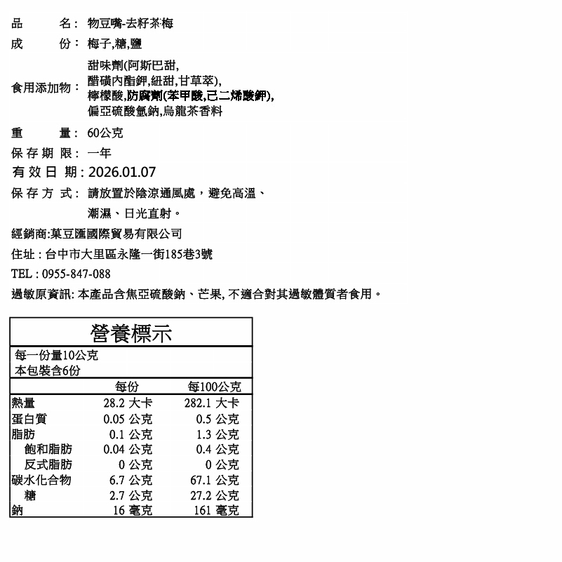 過敏原資訊: 本產品含偏亞硫酸氫鈉,不適合對其過敏體質者食用