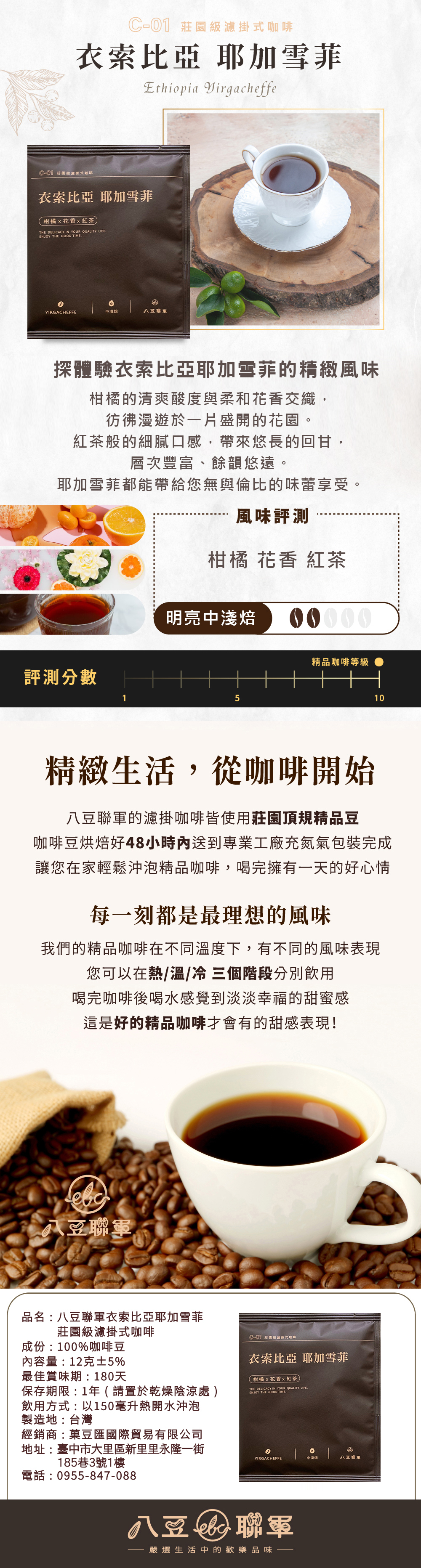 體驗衣索比亞耶加雪菲的精緻風味,柑橘的清爽酸度與柔和花香交織,彷彿漫遊於一片盛開的花園。紅茶般的細膩口感,帶來悠長的回甘,層次豐富、餘韻悠遠。無論是早晨醒腦,還是午後放鬆,耶加雪菲都能帶給您無與倫比的味蕾享受。