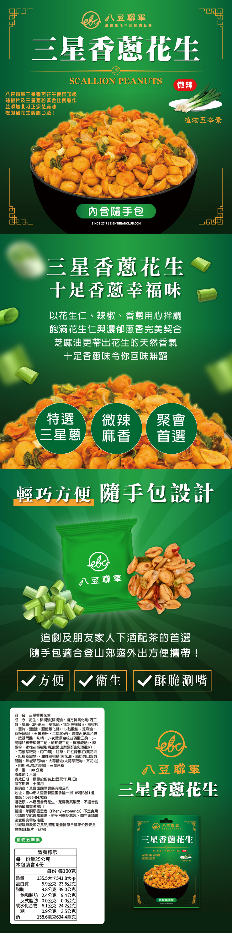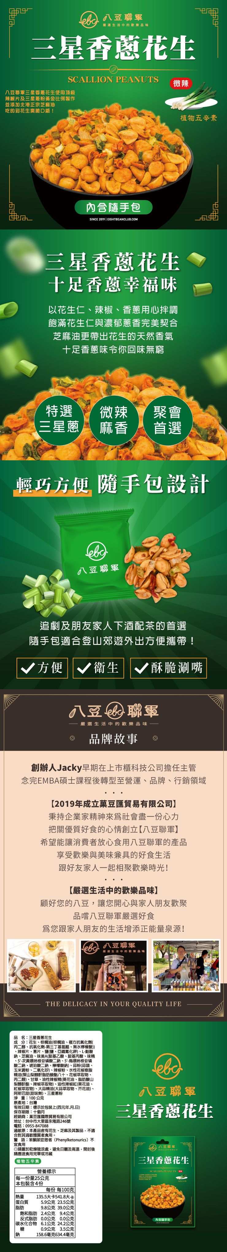◎ 八豆聯軍三星香蔥花生使用頂級辣椒片及三星蔥黃金比例製作,並添加北港正宗芝麻油,十足香蔥幸福味,涮嘴到讓你一口一口停不下來!